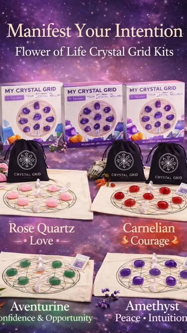 Awaken your altar and align your energy with this beautifully packaged Flower of Life Crystal Grid Kit. Designed for intentional living, this set allows you to build your own crystal grid using sacred geometry and authentic gemstones.